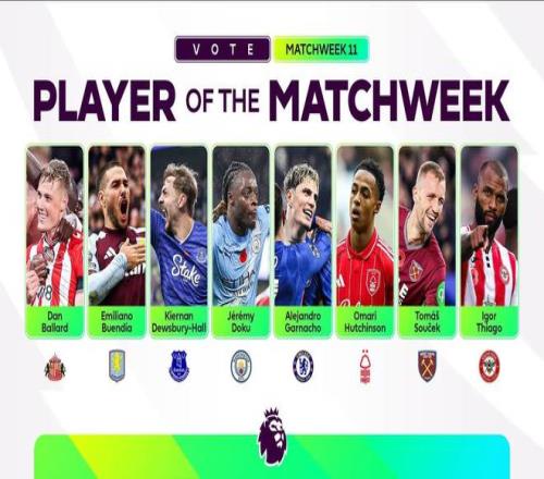 北京时间11月10日,英超官方公布了第11轮比赛最佳球员的候选名单,其中多库、加纳乔、布恩迪亚、巴拉德、迪尤斯伯里-霍尔、哈钦森、绍切克、伊戈尔-蒂亚戈在列。